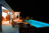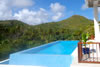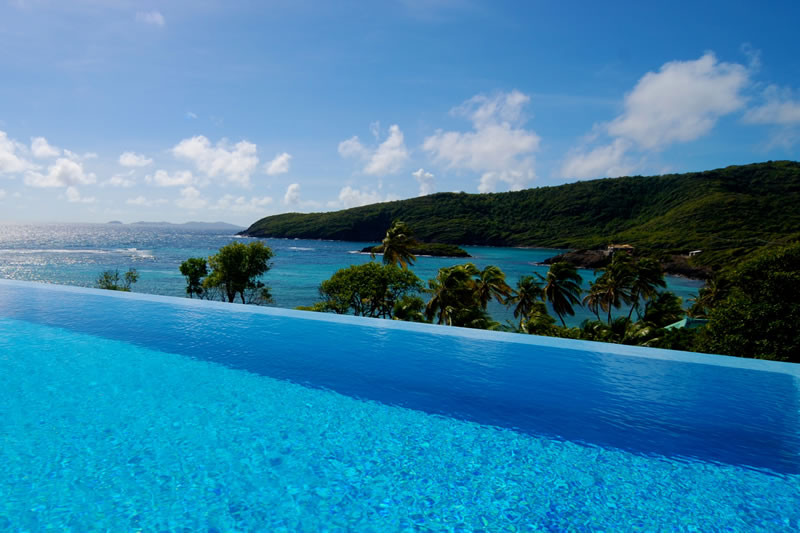 Sundeck and freshwater infinity swimming pool with ample sun loungers to relax in after taking a dip in the beautiful infinity pool looking directly South over the bay towards Mustique.